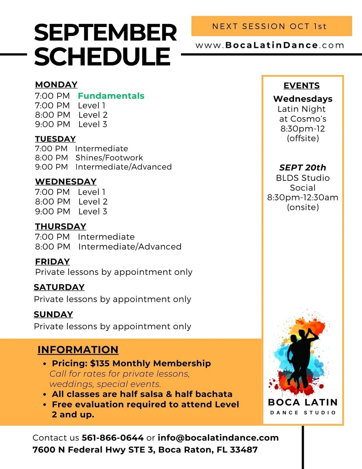 Our group latin dance classes are progressive and start the first week of every month. To attend a group classes, you must be on membership. All of our classes are half salsa and half bachata. Our dance studio is located in Boca Bay Plaza at 7600 N Federal Highway Suite 3, Boca Raton.